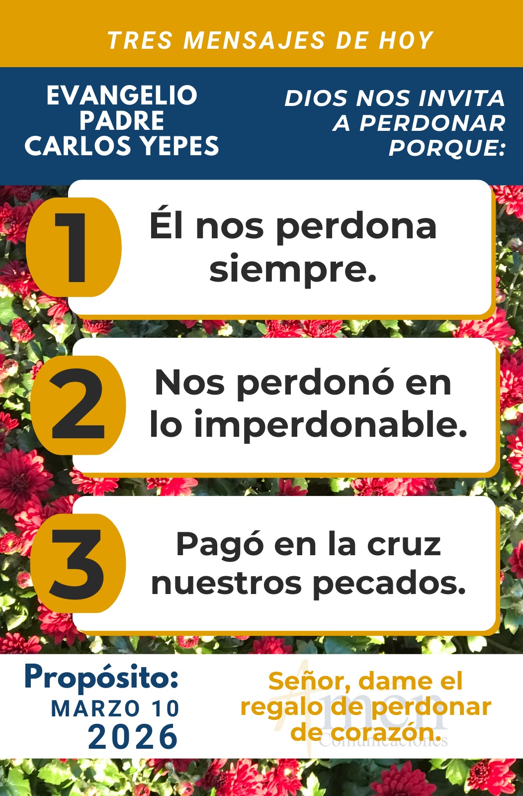 Hoy te invito a reconocer que, si Dios Padre en su Hijo Jesucristo en la cruz pagó lo impagable, tu pecado de toda la vida, perdonó lo imperdonable, ¿quién eres tú para no perdonar lo perdonable, esa pequeña ofensa que otra persona te ha cometido? Reflexiona.